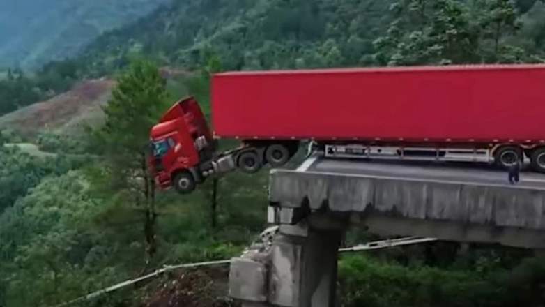Στιγμές αγωνίας εκτυλίχθηκαν στη νοτιοδυτική Κίνα, όταν μία νταλίκα βρέθηκε να κρέμεται στο κενό από μια κατεστραμμένη γέφυρα στην επαρχία Γκουιζού, μετά από σφοδρές βροχοπτώσεις και κατολισθήσεις που έπληξαν την περιοχή την Τρίτη.