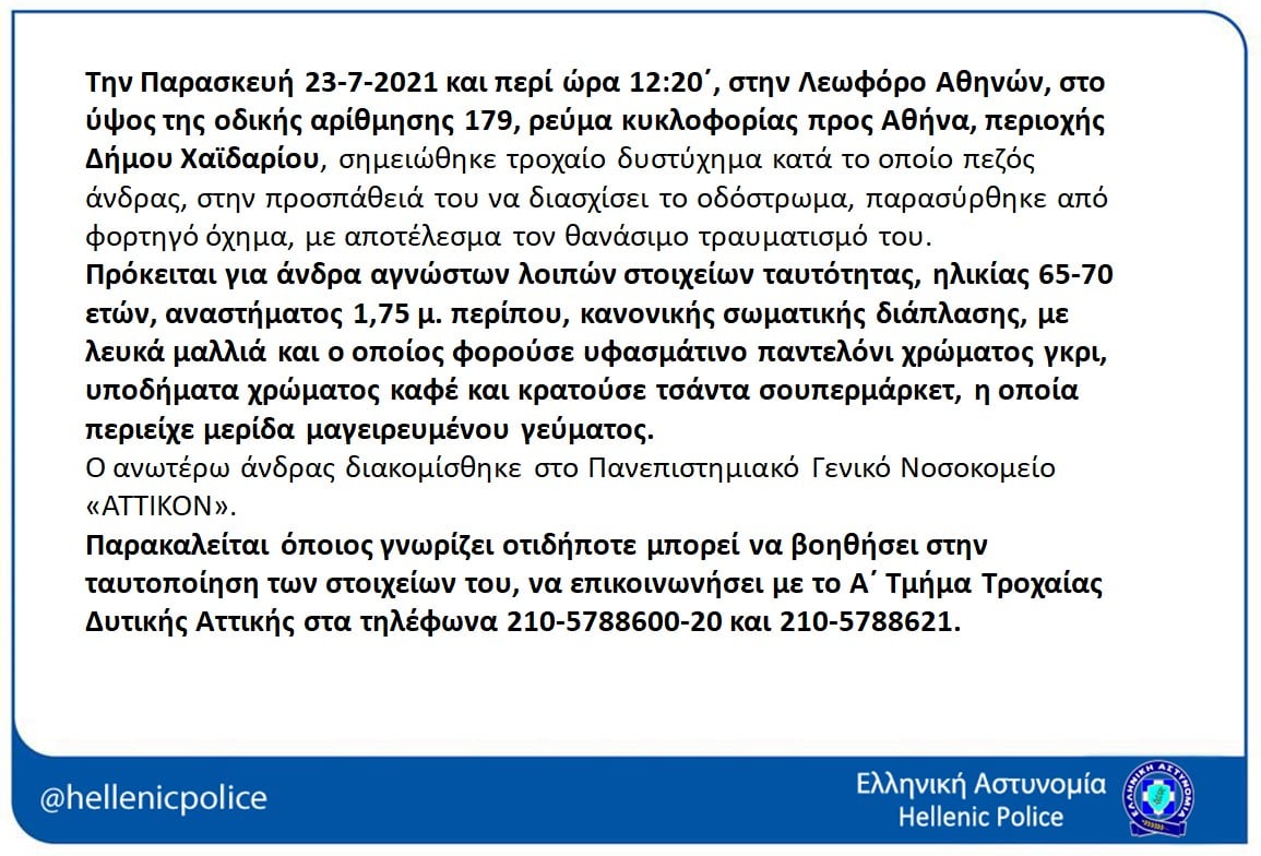 Την Παρασκευή 23-7-2021 και περί ώρα 12:20, στην Λεωφόρο Αθηνών, στο ύψος της οδικής αρίθμησης 179, ρεύμα κυκλοφορίας προς Αθήνα, περιοχής Δήμου Χαϊδαρίου, σημειώθηκε τροχαίο δυστύχημα κατά το οποίο πεζός άνδρας, στην προσπάθειά του να διασχίσει το οδόστρωμα, παρασύρθηκε από φορτηγό όχημα, με αποτέλεσμα τον θανάσιμο τραυματισμό του.