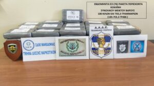 Μετά από ενδελεχή έλεγχο σε ένα εκ των εμπορευματοκιβωτίων εντοπίστηκαν και κατασχέθηκαν εβδομήντα έξι (76) συσκευασίες περιέχουσες ναρκωτική ουσία κοκαΐνη, συνολικού μικτού βάρους εκατό κιλών, επτακοσίων τριάντα γραμμαρίων και τριών δέκατων του γραμμαρίου (100.730,3gr).